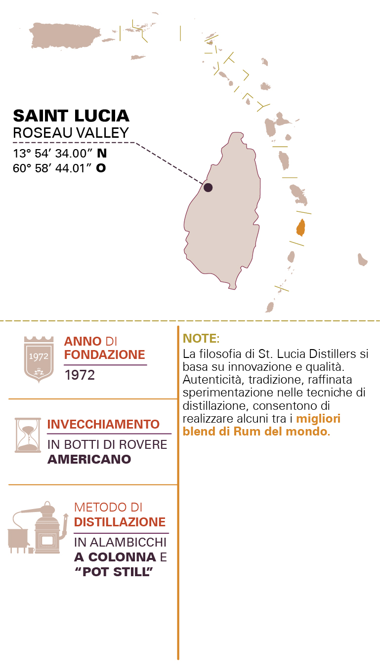 ZONA PRODUTTIVARoseau Valley St. Lucia MATERIA PRIMAMelassa DISTILLAZIONEUnione di rum distillati con metodo continuo e discontinuo. COLOREAmbra scuro PROFUMOBanana cotta, frutta caramellata, rovere e vaniglia. SAPOREBen bilanciato al palato con note di cioccolato, uva passa, tabacco e chiodi di garofano. Il è lungo e cremoso. NOTELa filosofia di St Lucia Distillers si basa su innovazione e qualità. Autenticità tradizione raffinata sperimentazione nelle tecniche di distillazione consentono di realizzare alcuni tra i migliori blend di Rum del mondo. INVECCHIAMENTOSeparata per lotto e tipologia di distillazione in botti ex Bourbon dopo la miscelazione il rum riposa in botti di rovere per ulteriori 6 mesi. L'invecchiamento medio è di 5 anni.