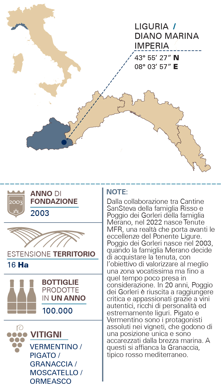 TIPOLOGIADOC Riviera Ligure di Ponente ZONA PRODUTTIVALiguria VITIGNO100% Rossese di Albenga TIPOLOGIA DEL TERRENOTerreno argilloso ETÀ DEI VIGNETI30 anni SISTEMA DI ALLEVAMENTOGuyot semplice COLOREColore buccia di cipolla PROFUMOProfumo fragrante e fruttato ABBINAMENTIPiatti della tradizione ligure SAPOREAl palato fresco e secco INVECCHIAMENTO6 mesi