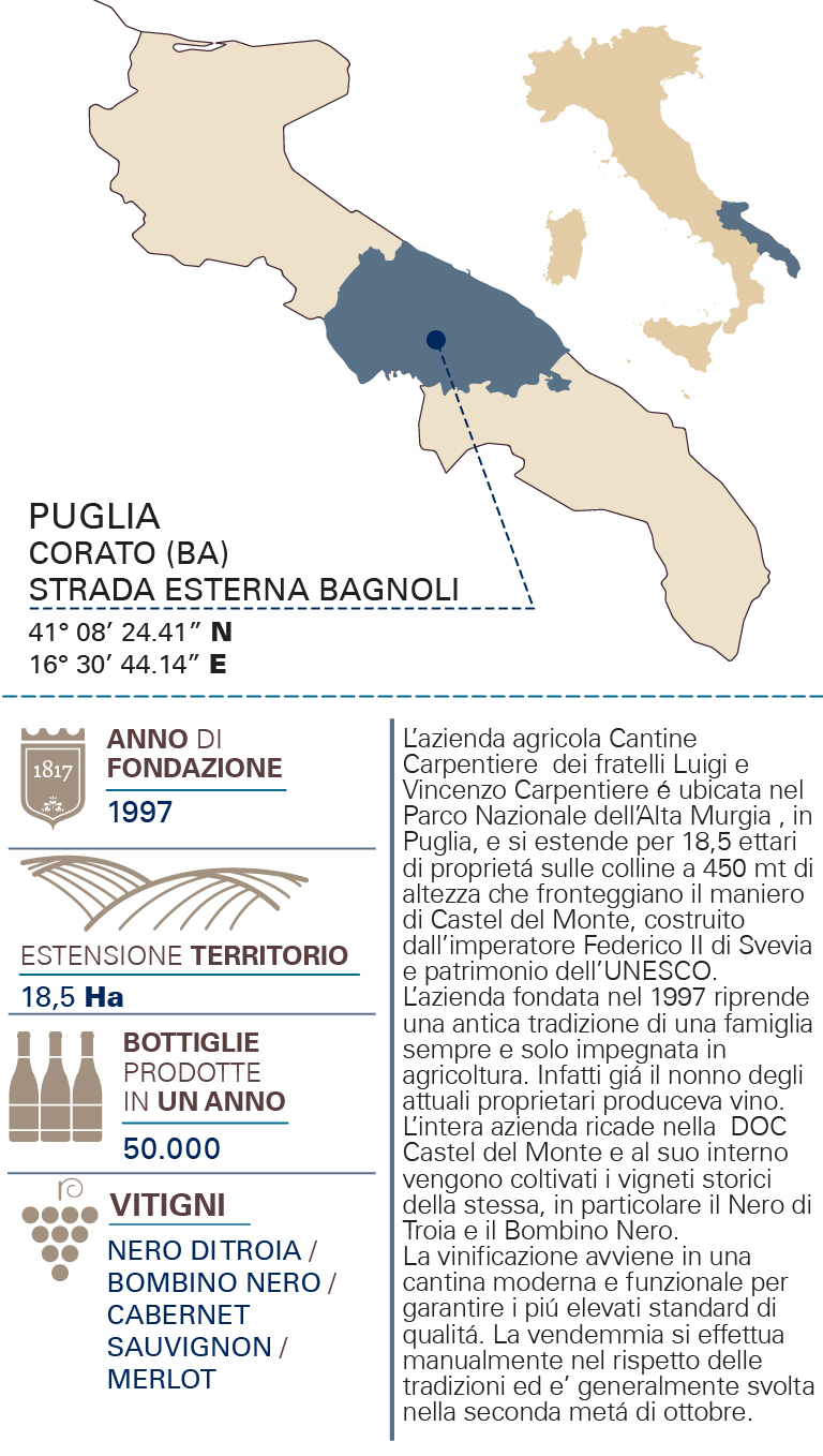 TIPOLOGIAVino Bianco ZONA PRODUTTIVACorato VITIGNO100% Nero di Troia VINIFICAZIONEVendemmia manuale. Lieviti autoctoni in acciaio a bassa temperatura. SISTEMA DI ALLEVAMENTOControspalliera a Guyot 450 m s.l.m. in zona carsica. COLOREGiallo paglierino PROFUMOLa sua incantevole ricchezza aromatica spazia dalle note agrumate a quelle di mora selvatica, dai sentori di mela cotogna a quelli di zucchero a velo, con spiccate sensazioni di miele. ABBINAMENTIOttimo con i secondi di pesce, è ideale in abbinamento al polpo arrosto con misticanza. SAPOREPolposo e minerale.