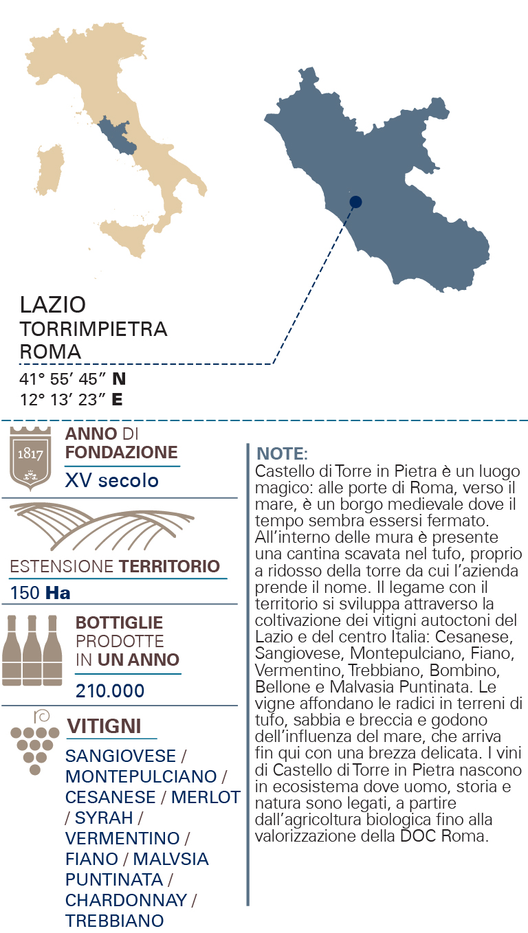 TIPOLOGIAIGT Lazio Rosso ZONA PRODUTTIVATorrimpietra VITIGNOSangiovese, Merlot e altre varietà tipiche TIPOLOGIA DEL TERRENOTerreni calcareo-argillosi VINIFICAZIONEFermentazione in acciaio inox separata per le tre varietà. Fermentazione malolattica in cemento. Assemblaggio a metà gennaio e imbottigliamento a febbraio COLOREColore rosso rubino intenso con lievi sfumature violacee PROFUMOAl naso è vinoso e fruttato, con note di visciola e bacche rosse ABBINAMENTIPerfetto con antipasti di salumi e formaggi, patè rustici o sulla classica amatriciana e primi piatti al ragù. Si abbina a secondi piatti come maiale al latte, grigliate di carni, bolliti misti. Accompagna inoltre formaggi a pasta dura SAPOREAl palato è di buona struttura ed equilibrio, con un tannino ben dosato e un finale sapido INVECCHIAMENTOAffinamento in vasche in cemento con micro-ossigenazione, quindi in bottiglia per almeno 2 mesi
