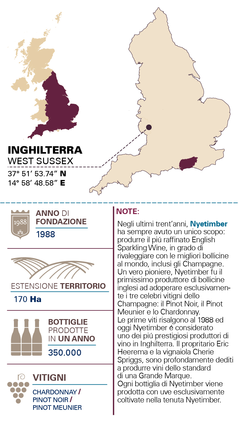 TIPOLOGIAEnglish sparkling wine ZONA PRODUTTIVAWest Sussex VITIGNO55/65% Chardonnay, 30/40% Pinot Noir, 5/15% Meunier TIPOLOGIA DEL TERRENOTerreni ricchi di sabbia e gesso. VINIFICAZIONERaccolta e selezione a mano delle uve che devono essere pressate il prima possibile. I succhi sono assaggiati, valutati e infine trasferiti per dare inizio alla vinificazione. Ogni varietà viene lavorata separatamente per preservare le singole caratteristiche. Dopo la prima fermentazione con i lieviti, inizia l'assemblaggio dei vari blend e poi il trasferimento in vetro. A questo punto vengono inseriti i lieviti in ogni bottiglia e inizia la seconda fermentazione. COLOREGiallo oro chiaro con perlage fine e persistente. PROFUMOComplessi aromi tostati e speziati. ABBINAMENTIPerfetto per accompagnare salmone affumicato, ostriche, capesante e sushi. SAPOREPalato fine, elegante con una grande combinazione di intensità, delicatezza e lunghezza. Vengono ripresi gli aromi percepiti durante l'esame olfattivo che sono completati da sentori di miele, mandorla, mela cotta e pasticceria. INVECCHIAMENTOAffinamento minimo 3 anni in bottiglia. Dopo la sboccatura il prodotto riposa diversi mesi prima della messa in commercio.