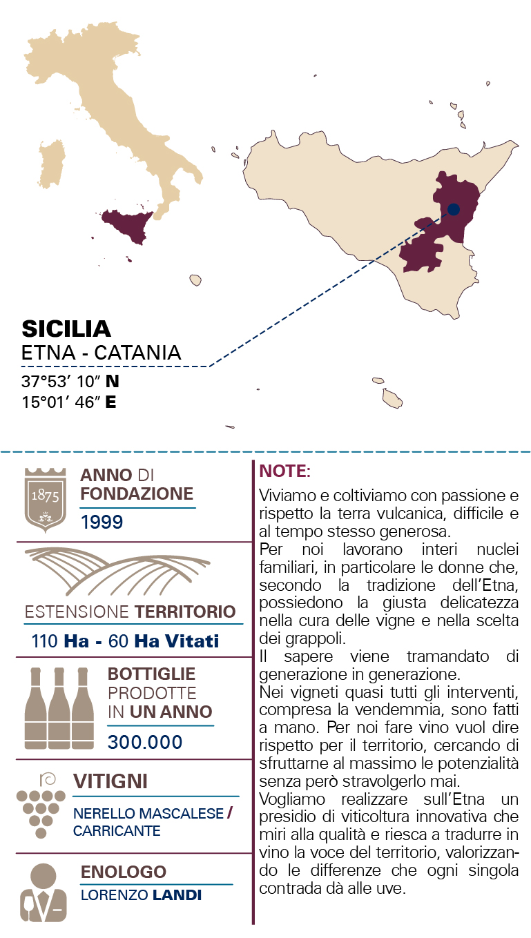 • SAPOREUn vino ricco, profondo, di grande sapidità che raccoglie dentro di sé le caratteristiche tipiche del suolo vulcanico.