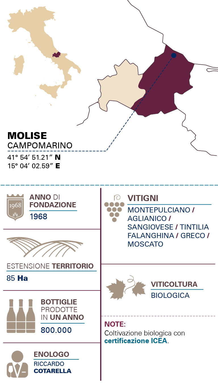 TIPOLOGIADOC Greco del Molise ZONA PRODUTTIVAContrada Camarda. VITIGNO100% Greco TIPOLOGIA DEL TERRENOSuolo calcareo-sabbioso ETÀ DEI VIGNETI15 anni VINIFICAZIONEMacerazione a freddo a contatto con le bucce per 24-36 ore. Fermentazione in vasche d'acciaio a 16-18 °C. SISTEMA DI ALLEVAMENTOSpalliera COLOREGiallo paglierino vivace PROFUMOProfumo ampio ed intenso, fruttato. ABBINAMENTISi accompagna a cibi delicati, frutti di mare, primi piatti, pesce e formaggi. Temperatura di servizio: 8-10 °C. SAPORESapore secco e morbido con sentori di frutta secca.