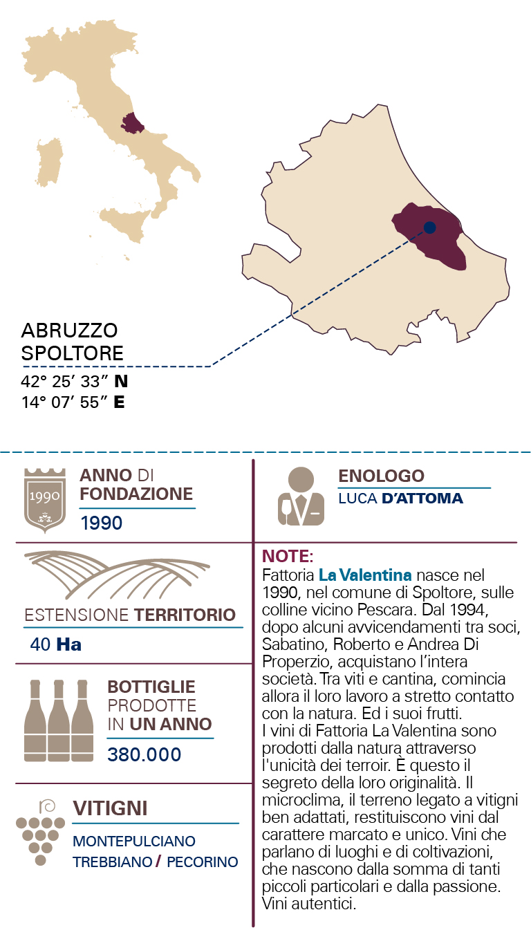 TIPOLOGIAIGT Colline Pescaresi ZONA PRODUTTIVAProvincia di Pescara. Altitudine 150-250 m s.l.m., esposizione sud-sud-ovest. VITIGNO100% Pecorino TIPOLOGIA DEL TERRENOSuolo argilloso di medio impasto. ETÀ DEI VIGNETI11-16 anni VINIFICAZIONEVendemmia da metà di settembre, pressatura soffice e tradizionale vinificazione in bianco in acciaio. SISTEMA DI ALLEVAMENTOPergola abruzzese modificata a filari. COLOREGiallo, quasi dorato PROFUMODecisa intensità di susina gialla, ginestra, mimosa, erba e soffi agrumati. SAPORECaldo ed equilibrato, ha scintillante chiusura sapida. L'aroma rivela sentori floreali freschi di biancospino, frutta esotica tipo mango e papaya, miele e note quasi iodate. Vivida freschezza sempre accompagnata da venature minerali.