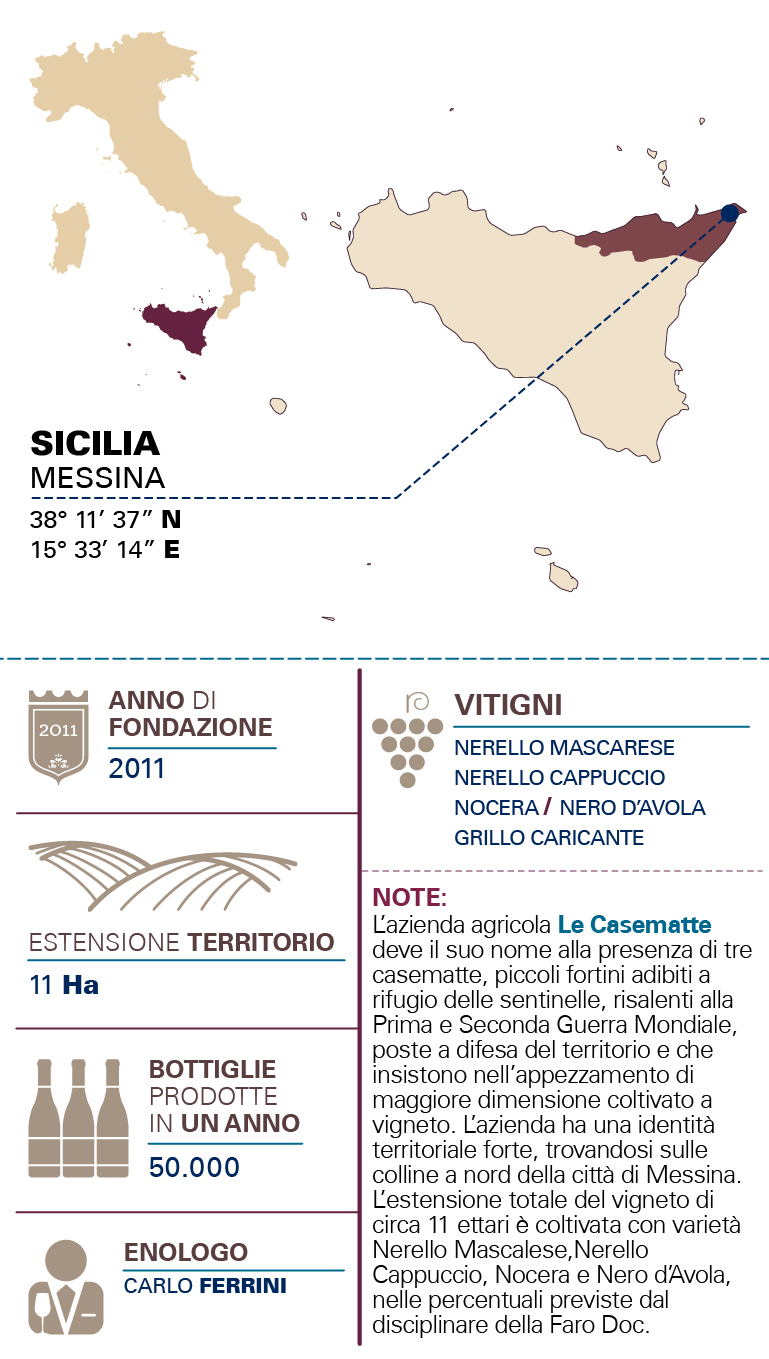 TIPOLOGIAIGP Terre Siciliane ZONA PRODUTTIVAComune di Messina VITIGNO100% Nerello Mascalese VINIFICAZIONEAggiunta di ghiaccio secco e fermentazione a bassa temperatura per circa 15 gg. Il vino rimane sulla feccia sino a gennaio, cui fa seguito l'assemblaggio. SISTEMA DI ALLEVAMENTOSpalliera COLORERosa corallo antico. PROFUMOPiccola frutta rossa, ribes e fragoline in particolare, a cui ben si sposano note minerali iodate e profumi floreali e di erbe aromatiche mediterranee. SAPOREFresco e sapido al palato dove il frutto, nitido e croccante, viene esaltato da un'acidità prorompente che rende particolarmente piacevole il finale lungo e appagante. INVECCHIAMENTOMaturazione in acciaio. Affinamento in bottiglia per tre mesi.