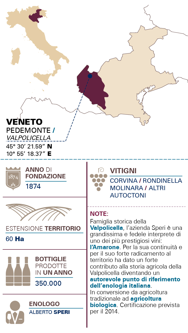 TIPOLOGIADOC Valpolicella ZONA PRODUTTIVADi proprietà dell'azienda Speri, dislocati in Valpolicella Classica tra i 120 e i 350 m./s.l.m. e precisamente nei comuni di San Pietro in Cariano, Fumane e Negrar. VITIGNO60% Corvina veronese, 30% Rondinella, 10% Molinara VINIFICAZIONERaccolta manuale dei grappoli; immediata pigiatura con pigiadiraspatrice; fermentazione con macerazione a temperatura controllata. COLORERosso rubino con riflessi violacei. PROFUMOProfumi vinosi intensi di viola e ciliegia. ABBINAMENTIIdeale come accompagnamento di antipasti, zuppe, pasta, e tipici piatti mediterranei. SAPOREVino di medio corpo, fruttato, da bere giovane. INVECCHIAMENTOPermanenza in acciaio e cemento vetrificato per 4 mesi. Affinamento in bottiglia.